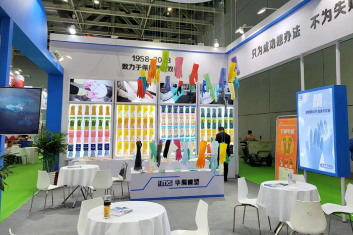 新的LOGO不仅展示着企业新形象,更昭示着华腾橡塑融入国内大循环、国内国际双循环的雄心。10月15日,华腾橡塑销售团队专程来到广州,参加第134届中国进出口商品交易会(广交会),在“工具展区”和“新材料及化工产品展区”架设两大展位,全面推销橡塑乳胶手套产品和胶板产品。在手套产品展位,展示了公司的家用手套和工业用手套。多种材质、用途可以充分满足客户的不同需求。公司自主研发的绝缘手套和干箱手套备受观众关注;在胶板产品展位,展示了工业、牧场、运动等系列胶板产品,花型种类丰富,可满足多种场合的应用需求。