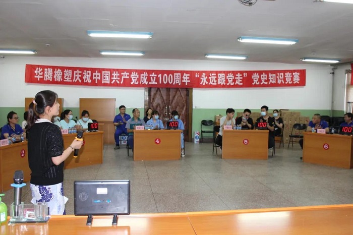 6月22日,华腾橡塑公司党委举办“永远跟党走”党史知识竞赛。活动旨在以赛促学,以学促干,激励广大党员干部满怀信心迈进建设行业领先的科技创新型企业新征程。此次竞赛共有8个党支部组队参加。各党支部书记、支部委员、入党积极分子、共青团员、群众代表参加活动,并参与观众答题环节。