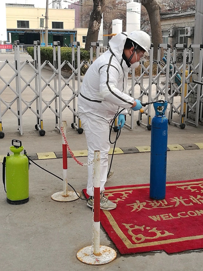 疫情发生以来,华腾冀春按照北化集团党委要求,全力做好疫情防控工作。公司在3天时间内购入口罩1000个,消毒液16桶,测温仪2个,高压喷水壶2个,保障公司全体值班人员每天2个口罩的替换需求。自疫情爆发以来,华腾冀春无一例确诊和疑似病例。